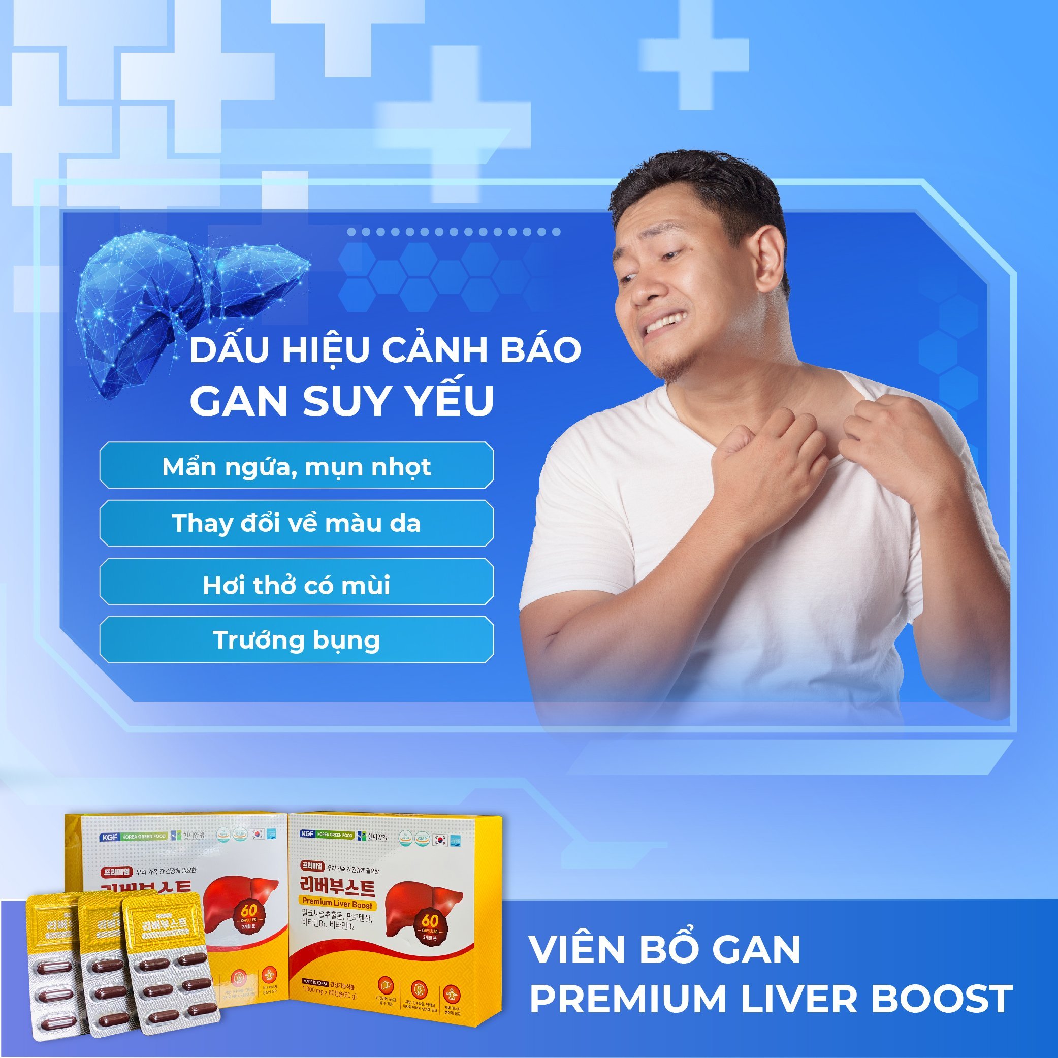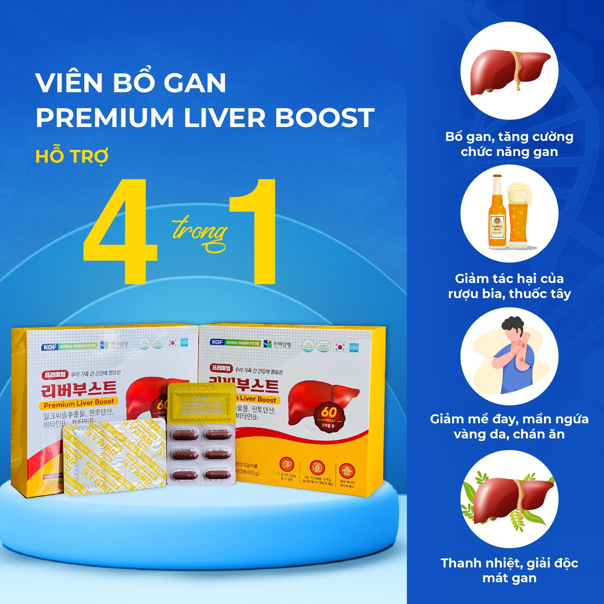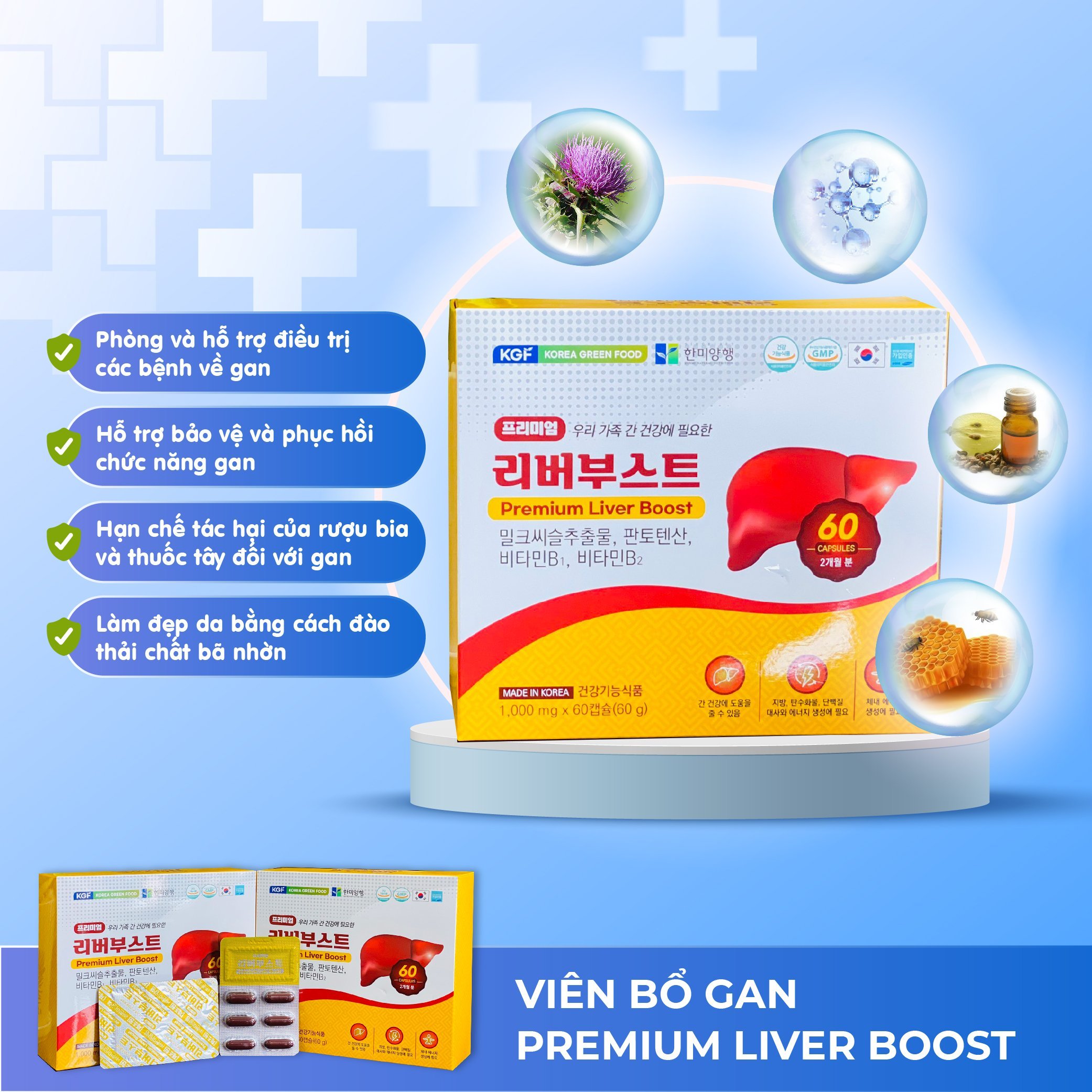 Viên Bổ Gan Premium Liver Boost 60 viên là sản phẩm chăm sóc sức khỏe cao cấp đến từ Korea Green Food (KGF) – thương hiệu nổi tiếng tại Hàn Quốc chuyên về thực phẩm chức năng.